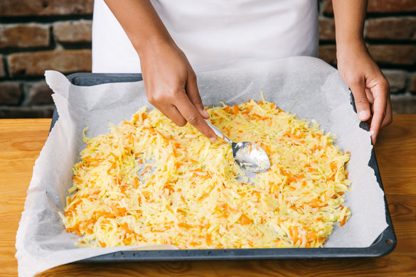 Den Ofen auf 200°C Umluft oder 210°C Ober-/Unterhitze vorheizen. Die Karotten und Kartoffeln schälen und grob mit der Küchenreibe raspeln. Beides mit ca. 1/2TL Salz mischen und für ca. 5Min. ruhen lassen.