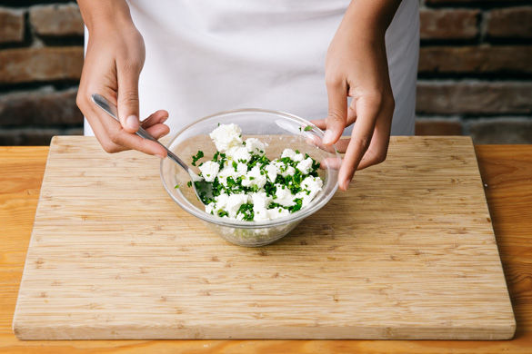 Inzwischen den Käse grob zerkleinern. Die Petersilie samt Stängel und den Schnittlauch fein hacken und mit Käse und schwarzen Pfeffer mischen. Tipp: Wer mag, kann etwas Petersilie für die Garnitur aufheben.
