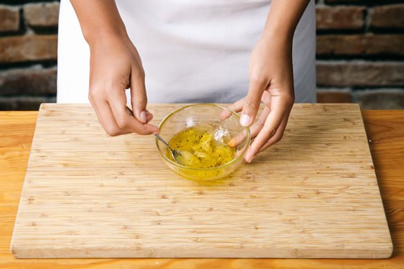 Aus 1-2EL Olivenöl, 1-2EL Essig, Senf sowie Salz und Pfeffer ein leichtes Dressing anrühren.