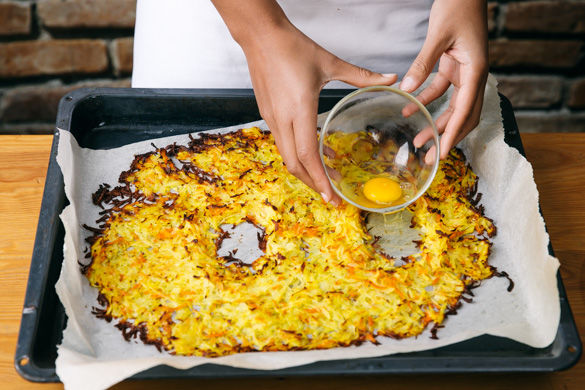 Da hat sich unsere Köchin Hannah etwas Besonderes für dich einfallen lassen: Dieser knusprige Kartoffelrösti kommt nicht alleine, sondern mit überbackenen Eiern und salzigem Hirtenkäse. Und für alle, die nicht lange braten wollen, kommt jetzt der Hit: Du schiebst das einfach alles in den Ofen… und schon fertig!