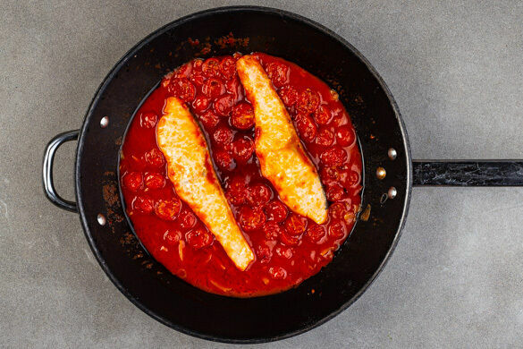 Den Fisch mit kaltem Wasser abspülen, trocken tupfen und evtl. vorhandene Gräten und Schuppen entfernen. Mit je 1 Prise Salz und Pfeffer würzen, in die Tomatensauce legen und abgedeckt 6–8Min. garen.