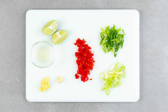In einem mittelgroßen Topf 600ml leicht gesalzenes Wasser aufkochen. Den Ingwer und den Knoblauch schälen und fein reiben. Den weißen Teil und den grünen Teil der Lauchzwiebeln separat in feine, schräge Ringe schneiden. Die Peperoni längs halbieren und in hauchdünne Streifen schneiden. Eine Limette halbieren und auspressen, die andere Limette in Spalten schneiden.