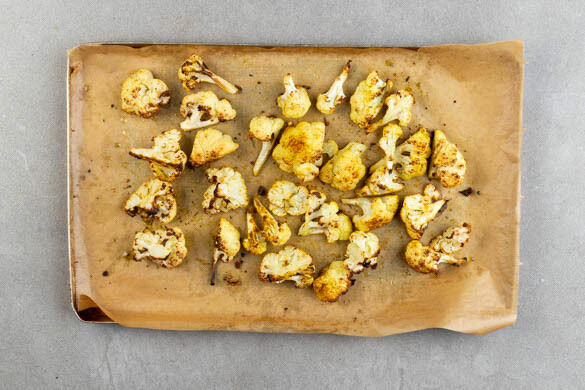 Den Blumenkohl in mundgerechte Röschen schneiden und auf einem mit Backpapier ausgelegten Backblech mit der ½ der Ras-el-Hanout-Gewürzmischung, 1EL Olivenöl und 1 kräftigen Prise Salz vermengen. Im oberen Teil des Backofens 15–20Min. backen, bis der Blumenkohl appetitlich gebräunt ist. Zum Abkühlen aus dem Ofen nehmen.