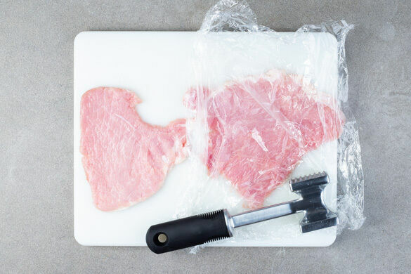 Den Backofen auf 170°C (150°C Umluft) vorheizen. Das Fleisch trocken tupfen und jeweils zwischen zwei Lagen Frischhaltefolie mit einem Fleischklopfer oder mit dem Boden einer schweren Pfanne ca. 0,5cm dünn plattieren. Das Fleisch von beiden Seiten mit je 1 Prise Salz und Pfeffer würzen.