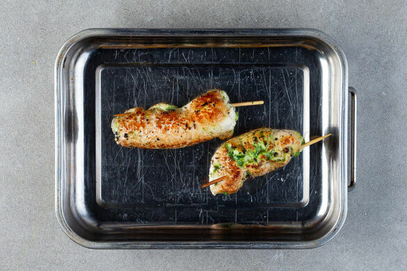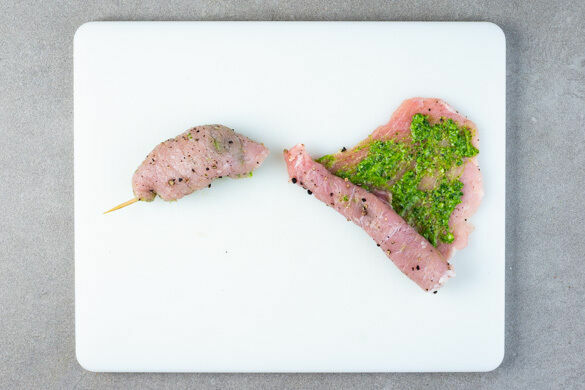 Das Fleisch gleichmäßig mit dem Pesto bestreichen, aufrollen und mit Zahnstochern fixieren.