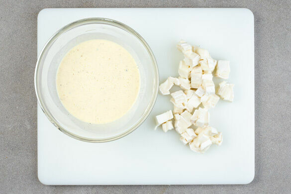 Die Eier mit der Crème fraîche verquirlen und mit je 1 Prise Salz und Pfeffer würzen. Den Feta in ca. 0,5cm große Würfel schneiden.