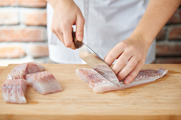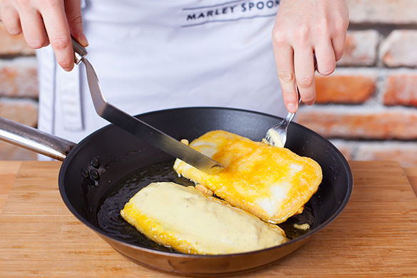 Fisch waschen, trocken tupfen, von evtl. Gräten befreien, in ca. 3-4cm dicke Stücke schneiden, salzen und pfeffern. Eine große Pfanne mit 8EL Öl auf mittlere Stufe erhitzen. Das Öl wird nur zum Ausbacken benötigt.