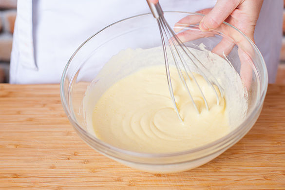 150g Mehl mit 250ml kalten Wasser (wenn möglich Mineralwasser), 2TL Backpulver, und einer sehr guten Prise Salz mithilfe eines Schneebesens in einer großen Schüssel zu einem glatten Teig verrühren, für den Moment beiseitestellen.