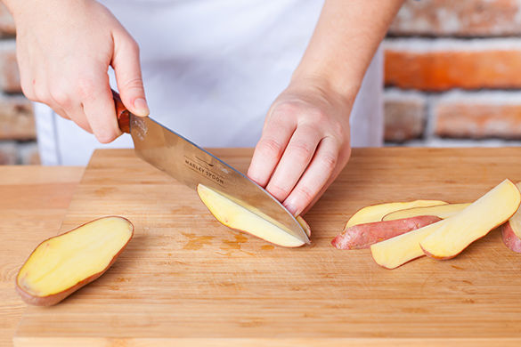 Ofen auf 220°C Ober-/Unterhitze vorheizen. Kartoffeln samt Schale in fingerdicke Streifen/Pommes schneiden. Auf ein mit Backpapier ausgelegtes Backblech legen, mit 4EL Öl und Prise Salz vermengen, gleichmässig verteilen und ca. 20-30Min. im Ofen knusprig backen, dabei einmal wenden.