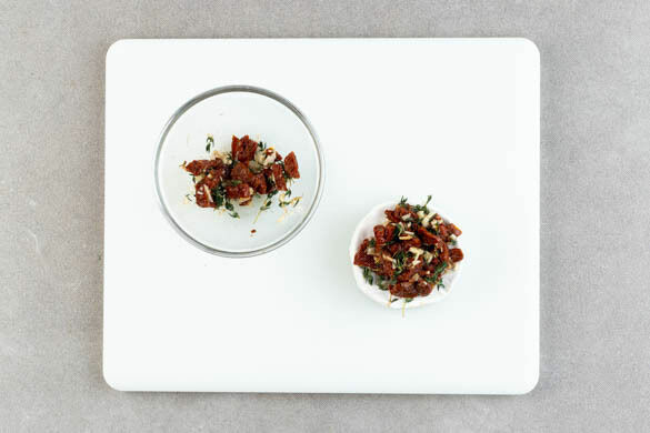 Den Knoblauch schälen und fein würfeln. Die Thymianblättchen von den Zweigen streifen. Die getrockneten Tomaten grob schneiden und mit dem Knoblauch und den Thymianblättchen vermengen. Mit 1 kräftigen Prise Pfeffer würzen. Ein X von etwa ⅔ Tiefe in die Camemberts schneiden, dann die Camemberts mit ⅔ der Tomatenmischung bestreichen.