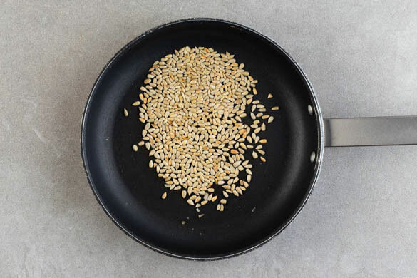 Die Sonnenblumenkerne in einer kleinen Pfanne ohne Zugabe von Fett bei mittlerer Hitze 1–2Min. goldbraun anrösten. Vorsicht, sie können schnell zu dunkel werden. Zum Abkühlen aus der Pfanne nehmen und beiseitestellen.