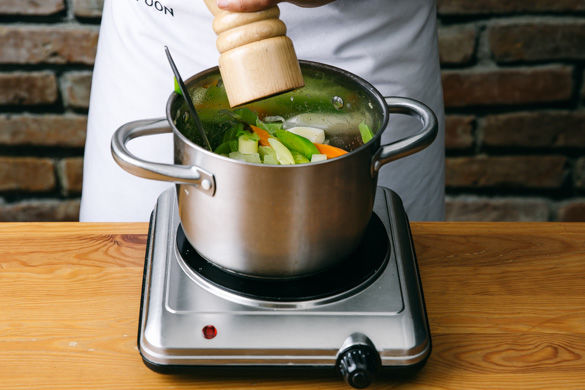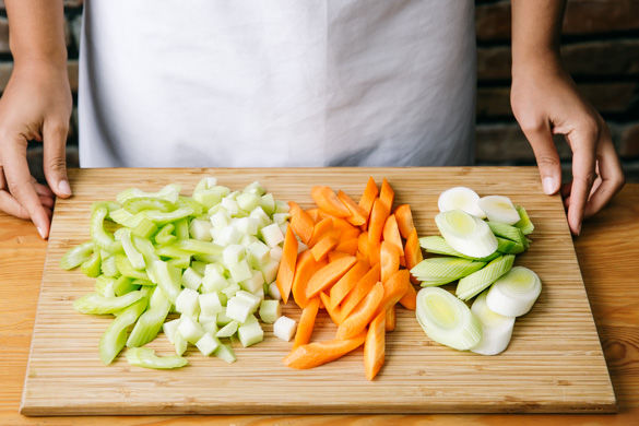 Den Grillbackofen auf 180°C vorheizen. In einem mittelgroßen Topf ausreichend leicht gesalzenes Wasser für das Gemüse aufsetzen. Den Kohlrabi schälen und in ca. 1cm große Würfel schneiden. Die Karotten schälen, längs halbieren und schräg in ca. 1cm dünne Scheiben schneiden. Den Lauch und den Stangensellerie schräg in ca. 1cm dünne Scheiben schneiden.