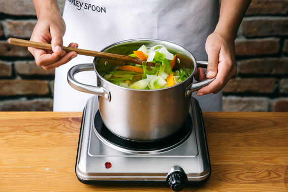 Den Kohlrabi, die Karotten und den Sellerie im kochenden Wasser ca. 6–8Min. bissfest garen. Den Lauch in der letzten Minute zugeben und mitkochen. Das Gemüse durch ein Sieb abgießen und wieder in den Topf geben.
