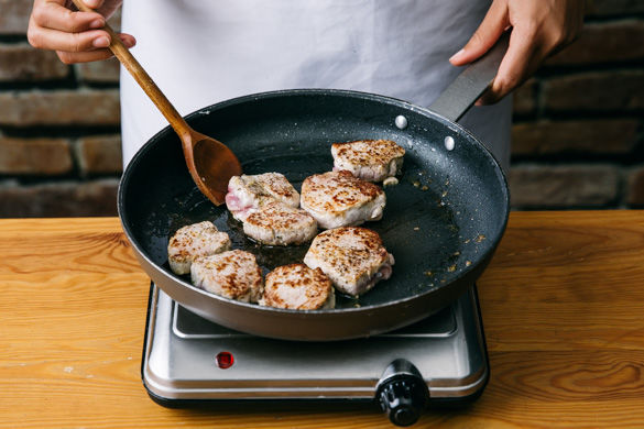Das Schweinerückensteak trocken tupfen, ggf. von Sehnen befreien und in ca. 8 Medaillons schneiden. Mit Salz und Pfeffer würzen und in einer mittelgroßen, ofenfesten Pfanne mit 1EL Olivenöl bei höchster Stufe von jeder Seite ca. 1–2Min. scharf anbraten.