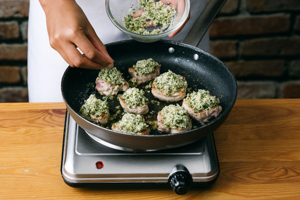 Die Medaillons mit der Panko-Butter-Mischung bestreichen, dabei die Panko-Kruste etwas andrücken. Im Ofen ca. 6–8Min. knusprig grillen.