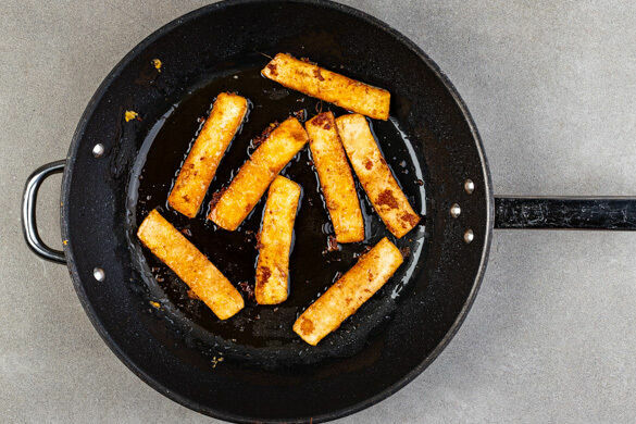 Den Tofu aus der Marinade nehmen und etwas abtropfen lassen. In einer mittelgroßen Pfanne mit 1EL Pflanzenöl bei mittlerer Hitze 2–3Min. knusprig braun anbraten. Dann wenden und nochmals 2–3Min. von der anderen Seite braten.