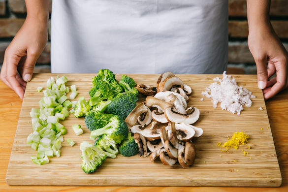 Den Brokkoli in mundgerechte Stücke schneiden, den Stamm schälen und in ca. 1cm. große Würfel schneiden. Die Pilze mit etwas Küchenkrepp oder einer Bürste von evtl. Dreck befreien und in dünne Scheiben schneiden. Die Schalotten schälen und fein hacken. Die Schale der Zitrone abreiben.