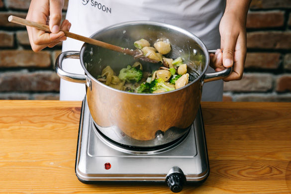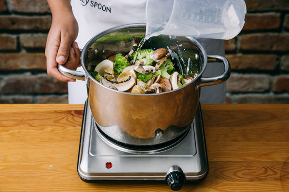 Die Pasta mit der Schlagsahne, Zitronenabrieb, Pilzen, Schalotten und Brokkoli sowie 400ml Wasser in einen großen Topf geben und auf mittlerer Hitze einmal mit Deckel aufkochen lassen.