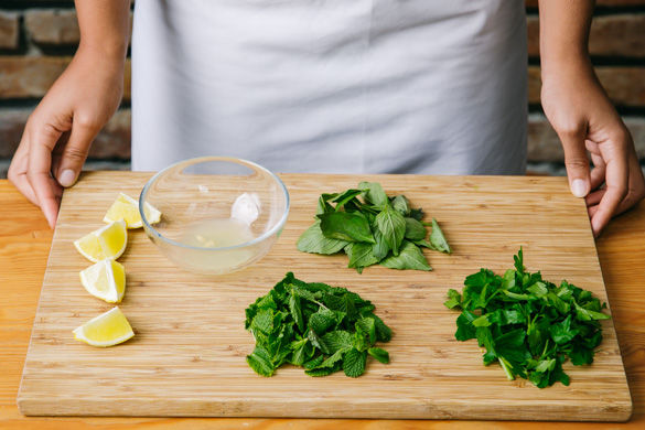In der Zwischenzeit die Hälfte der Zitrone entsaften, die andere Hälfte in Spalten schneiden. Die Minze und Basilikum vom Stängel zupfen. Die Petersilie samt Stängel grob hacken.