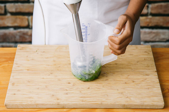 Die Minz- und Basilikumblätter mit gehackter Petersilie, 1-2EL Zitronensaft, 1-2EL Olivenöl und je einer Prise Zucker und Salz in einem hohen Gefäß mithilfe eines Stabmixers fein pürieren.