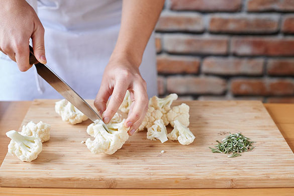 Ofen auf 210°C Umluft vorheizen. Evtl. äußere Blätter des Blumenkohls entfernen. Mundgerechte Röschen vom Strunk schneiden. Strunk wird nicht weiter benötigt.