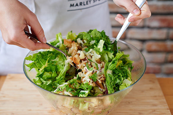 Das Gemüse und Brot aus dem Ofen nehmen und zusammen mit Sellerie, Petersilie und Salat in die Schüssel mit dem Dressing geben. Alles gut vermengen und evtl. nachwürzen. Auf Tellern anrichten.