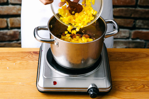 Die Chorizo in einem mittelgroßen Topf ca. 1–2Min. bei mittlerer Hitze anbraten, dann die Zwiebeln, den Knoblauch und die Paprika hinzugeben und weitere 2–3Min. mitbraten. Mit dem Gulaschgewürz bestäuben und mit den gehackten Tomaten ablöschen. Die Sauce ca. 5–6Min. leicht köcheln lassen und mit Salz und Pfeffer abschmecken.
