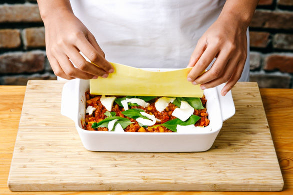 Die Lasagne im Ofen 15–20Min. überbacken, bis der Käse goldbraun ist und Blasen schlägt.