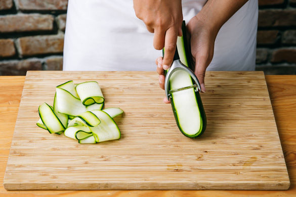 Den Ofen auf 200°C Umluft vorheizen. Die Enden der Zucchini entfernen und mit einem Sparschäler längs in dünne Streifen abschälen. Mit 1/2TL Salz mischen und für ca. 5Min. ziehen lassen, dann das überschüssige Wasser mit den Händen auswringen.
