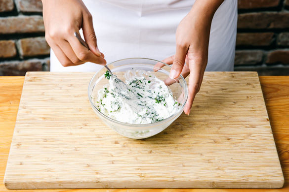 Inzwischen den Dill vom Stängel streifen und fein hacken. Den Schnittlauch und die Petersilie samt Stängel fein hacken. Den Knoblauch schälen und mit einer Knoblauchpresse pressen, oder sehr fein hacken. Den Ricotta mit Knoblauch, 1 Prise Salz, Pfeffer und der Hälfte der Kräuter mischen.