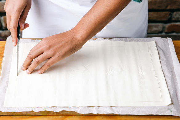 Die Blätterteige mit Papier auf zwei Backbleche ausrollen. Mit einem Messer einen ca. 1cm dicken Rand einschneiden. Vorsicht! Die Teige nicht durchschneiden! Die Teige mit einer Gabel mehrmals einstechen.