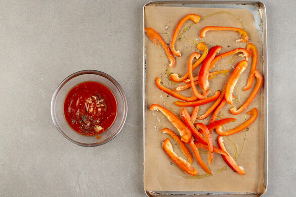 Den Backofen auf 240°C (220°C Umluft) vorheizen. Die Paprika vierteln, entkernen, in dünne Streifen schneiden und auf einem mit Backpapier ausgelegten Backblech mit 2TL Olivenöl und je 1 Prise Salz und Pfeffer einreiben. Den Knoblauch schälen und fein würfeln oder durch eine Knoblauchpresse drücken, dann mit der Tomatensauce, 1TL Honig und je 1 Prise Salz und Pfeffer verrühren.