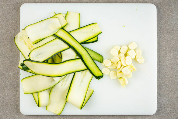 Die Paprika im Ofen 6–8Min. backen, bis sie beginnt, weich zu werden. Die Zucchini mit einem Sparschäler rundum in breite Streifen schneiden, das weiche Kerngehäuse quer in dünne Scheiben schneiden.