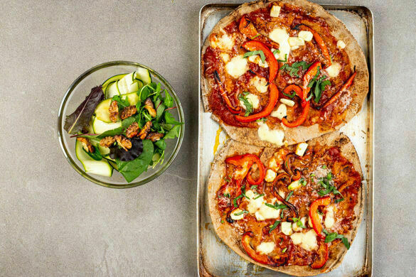 Leichtigkeit ist etwas Wunderbares, nicht nur im Leben, sondern auch im Magen. Zeit, dass sich altbekannte Wohlfühlgerichte in neuem Glanz zeigen! Heute: Pizza! Mit einem knusprigen Boden aus Vollkornfladenbrot und einem vegetarischen Belag aus Paprika, Zucchini, Mozzarella und aromatischem Basilikum. Dazu gibt es einen frischen Salat mit leckerem Dressing und Walnüssen. Leicht gemacht – schnell verputzt!