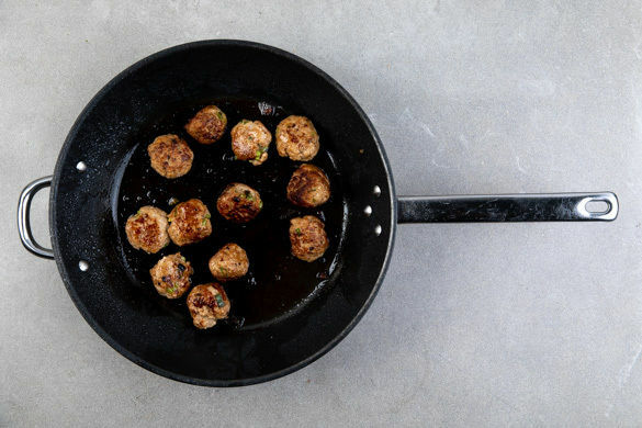Inzwischen die Hackbällchen in einer großen Pfanne mit 1EL Pflanzenöl bei mittlerer Hitze ca. 5Min. rundum anbraten. Aus der Pfanne nehmen und beiseitestellen, die Pfanne für den nächsten Schritt aufbewahren.