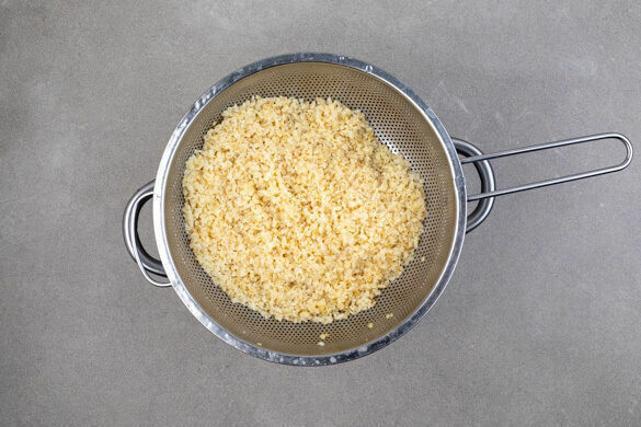 In einem mittelgroßen Topf 600ml leicht gesalzenes Wasser mit dem Brühgewürz zum Kochen bringen. Den Bulgur in das kochende Wasser rühren und abgedeckt bei niedriger Hitze 5–7Min. sanft köcheln lassen, bis das Wasser aufgesaugt und der Bulgur gar ist. Den Bulgur abgedeckt ohne Hitzezufuhr bis zum Servieren ziehen lassen.