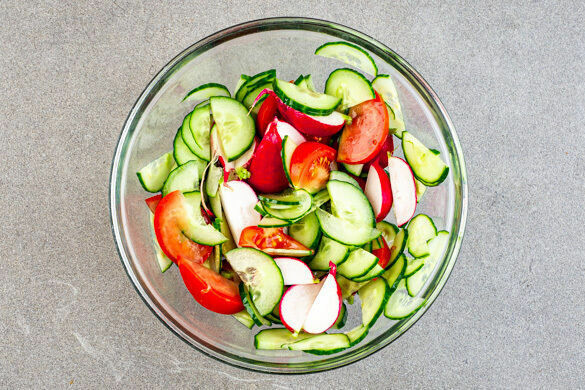 Die Gurke längs halbieren und quer in dünne Scheiben schneiden. Die Radieschen je nach Größe halbieren oder vierteln. Die Tomaten halbieren und in dünne Spalten schneiden, dann mit den Gurken und den Radieschen vermengen.