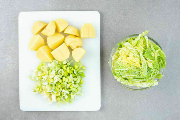 Die Kartoffeln schälen und je nach Größe halbieren oder vierteln. Den Wirsing halbieren, vom Strunk befreien und in feine Streifen schneiden. Den Lauch längs halbieren und quer in feine Streifen schneiden.