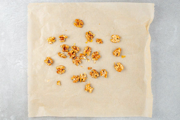 In einer kleinen Pfanne 1EL Zucker bei mittlerer Hitze goldbraun schmelzen lassen. Die Walnüsse dazugeben und ca. 30Sek. in dem Zucker karamellisieren lassen. Auf etwas Backpapier auskühlen lassen. Vorsicht, die Walnüsse sind sehr heiß! Die abgekühlten Walnüsse grob hacken.
