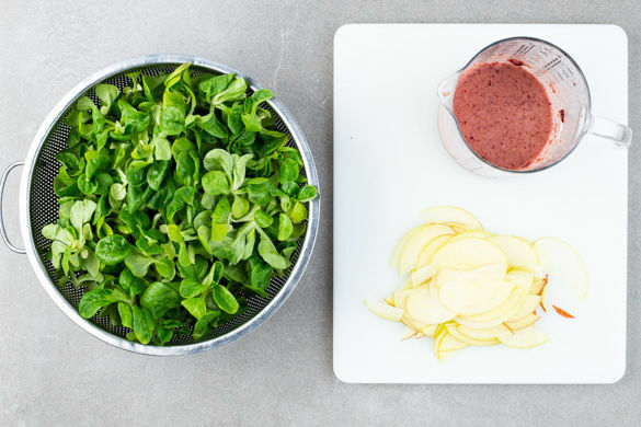 Den Feldsalat ggf. verlesen. Den Apfel vierteln, vom Kerngehäuse befreien und in dünne Scheiben schneiden. Für das Dressing die Cranberrys samt Einweichwasser in einem hohen Gefäß mit je 1EL Olivenöl und Balsamicoessig cremig pürieren und mit Salz und Pfeffer abschmecken.