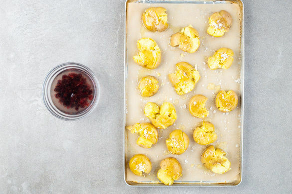 Die Kartoffeln in ein Sieb abgießen und auf ein mit Backpapier ausgelegtes Backblech geben. Mit der Unterseite des Topfes leicht platt drücken und mit 2EL Olivenöl sowie 1 kräftigen Prise Salz vermengen, dann im Ofen ca. 15Min. backen. Die Cranberrys in 100ml heißem Wasser einweichen.