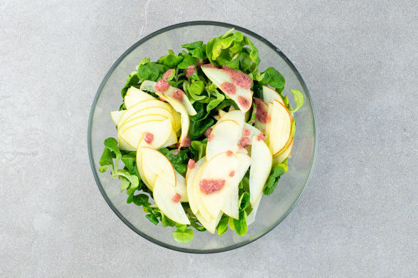 Den Feldsalat ggf. verlesen. Die Äpfel vierteln, vom Kerngehäuse befreien und in dünne Scheiben schneiden. Für das Dressing die Cranberrys samt Einweichwasser in einem hohen Gefäß mit je 2EL Olivenöl und Balsamicoessig cremig pürieren und mit Salz und Pfeffer abschmecken.
