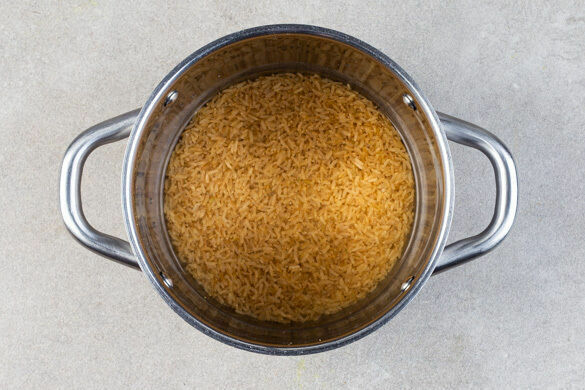 Den Reis in das kochende Wasser geben und abgedeckt bei niedrigster Hitze 8–10Min. kochen, bis das Wasser aufgesogen und der Reis gar ist. Noch ca. 5Min. ohne Hitzezufuhr ziehen lassen.