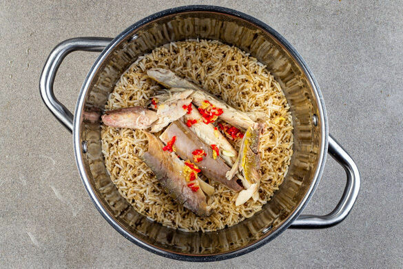 Die Makrele mit einem scharfen Messer von der Haut befreien und in mundgerechte Stücke zupfen, dabei evtl. größere Gräten entfernen. Die Makrelenstücke auf den gekochten Reis legen, mit 2EL Würzsauce beträufeln und abgedeckt mindestens 5Min. ziehen lassen.