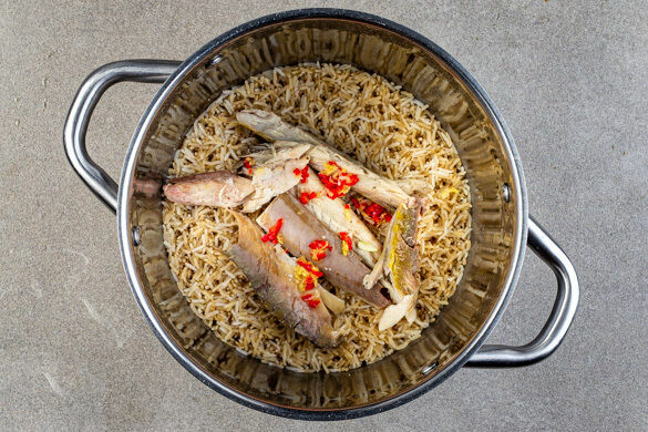 Die Makrele mit einem scharfen Messer von der Haut befreien und in mundgerechte Stücke zupfen, dabei evtl. größere Gräten entfernen. Die Makrelenstücke auf den gekochten Reis legen, mit 1EL Würzsauce beträufeln und abgedeckt mindestens 5Min. ziehen lassen.