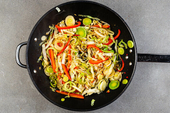 Den Gemüsemix in einer mittelgroßen Pfanne oder einem Wok mit 1EL Pflanzenöl bei starker Hitze 2–3Min. anbraten. Mit der restlichen Würzsauce ablöschen und 1–2Min. weiterbraten, bis ein Großteil der Flüssigkeit verdampft ist.
