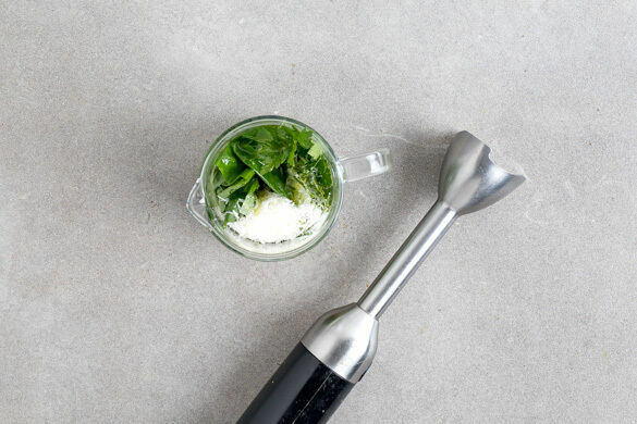 Den Käse fein reiben. Das Basilikum und die Petersilie samt Stängeln grob schneiden und mit dem Käse sowie 2EL Olivenöl in einem hohen Gefäß mit einem Stabmixer zu einem glatten Pesto pürieren. Ggf. noch 1–2EL Olivenöl oder etwas Wasser hinzugeben. Das Pesto mit Salz abschmecken.