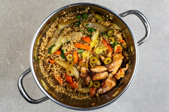 Das kochende Wasser und den Perlencouscous zu dem Gemüse in den Topf geben. ¾ des Brühgewürzes unterrühren und den Perlencouscous abgedeckt bei mittlerer Hitze 8–10Min. sanft köcheln lassen, bis die Brühe aufgesaugt und der Perlencouscous gar ist.