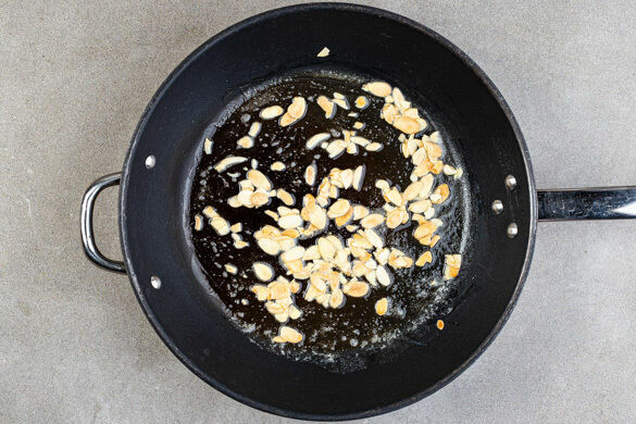 1,2L Wasser in einem Wasserkocher aufkochen. Die Mandelblättchen in einer großen Pfanne mit 1EL Butter und 1 Prise Salz bei mittlerer Hitze 3–4Min. goldbraun anrösten. Vorsicht, sie können schnell zu dunkel werden. Zum Abkühlen aus der Pfanne nehmen und beiseitestellen. Die Pfanne aufbewahren.