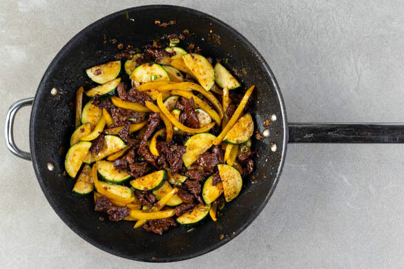 Das Fleisch trocken tupfen und in der Pfanne mit 1EL Pflanzenöl bei starker Hitze ca. 1Min. rundum scharf anbraten. Die weißen Lauchzwiebelringe dazugeben und kurz mitbraten, dann die Sojasauce und 1EL Honig unterrühren, nach Geschmack kräftig mit Pfeffer würzen und alles weitere 1–2Min. braten. Die Zucchini und die Paprika untermengen.